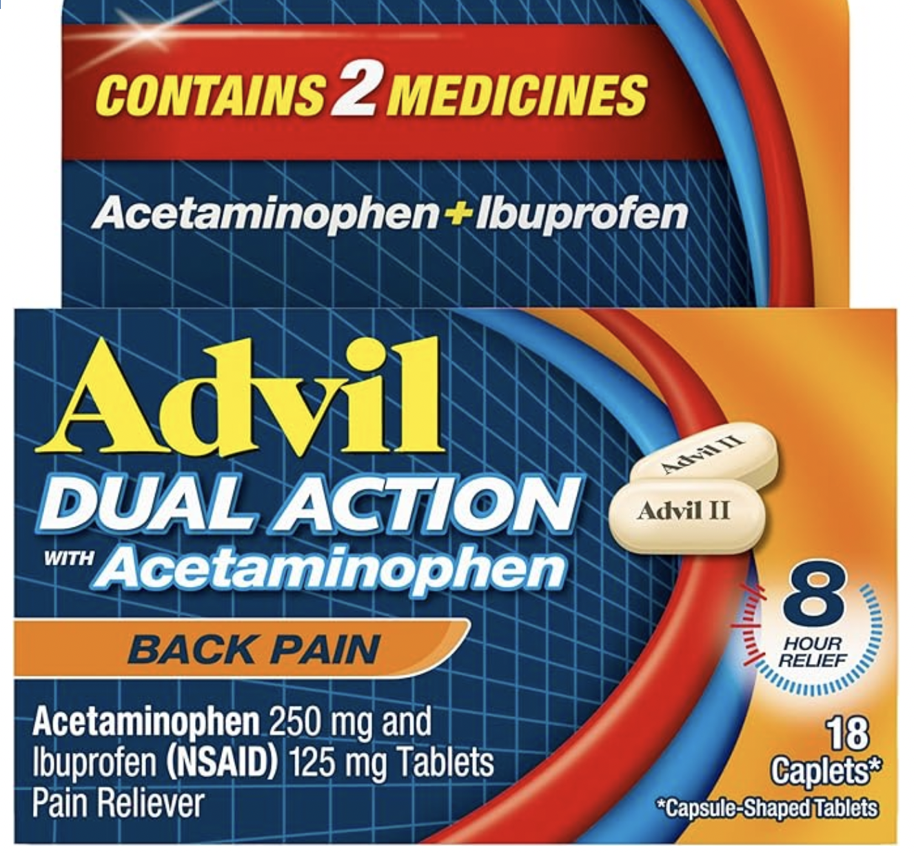 -Each caplet contains acetaminophen and ibuprofen for back pain relief; back pain medication also provides headache, toothache, menstrual cramp, muscle pain and lower back pain relief.