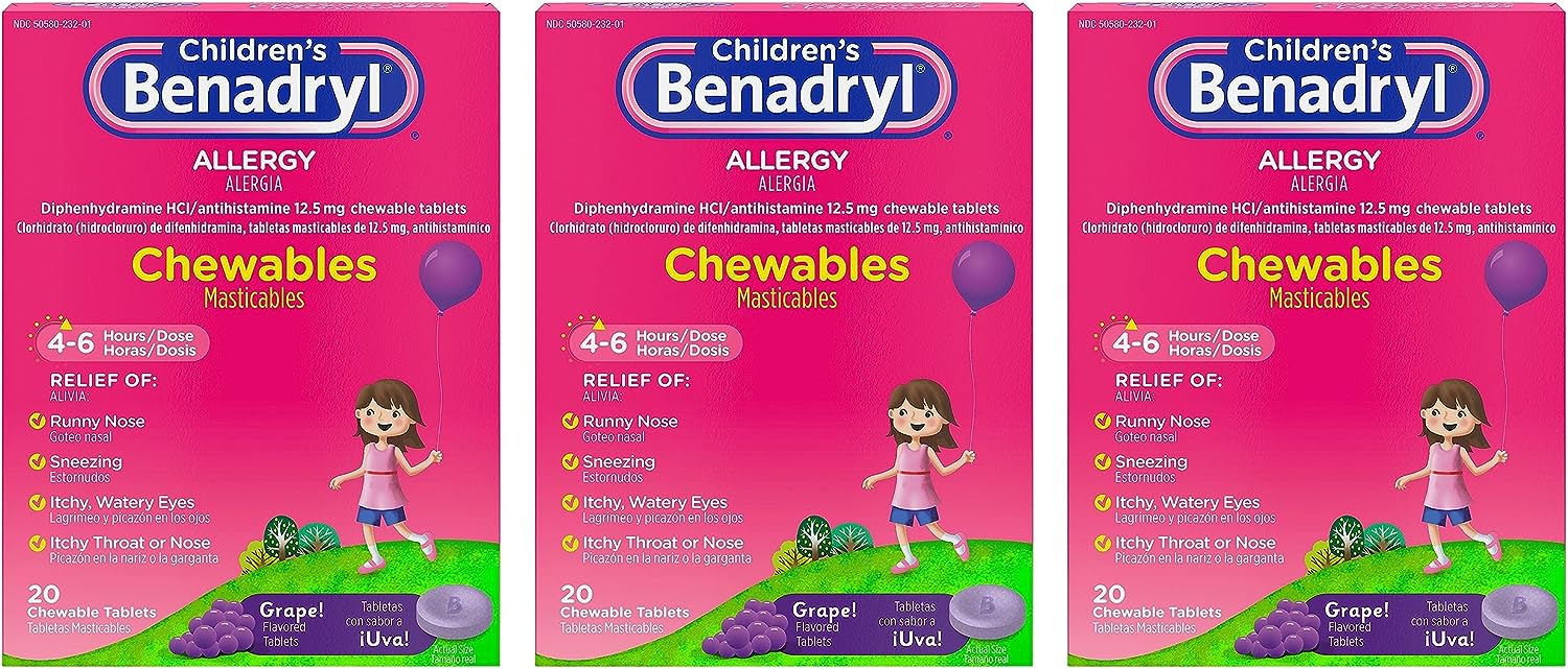 - Kids’ Benadryl Allergy Chewables in a kid-friendly grape flavor are specially formulated to provide temporary relief of allergy symptoms such as sneezing & itchy throat, caused by hay fever & other upper respiratory allergies