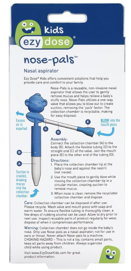– Nose-Pals aspirator allows you to blow out to create suction, eliminating the need for filters and bringing peace of mind to caregivers