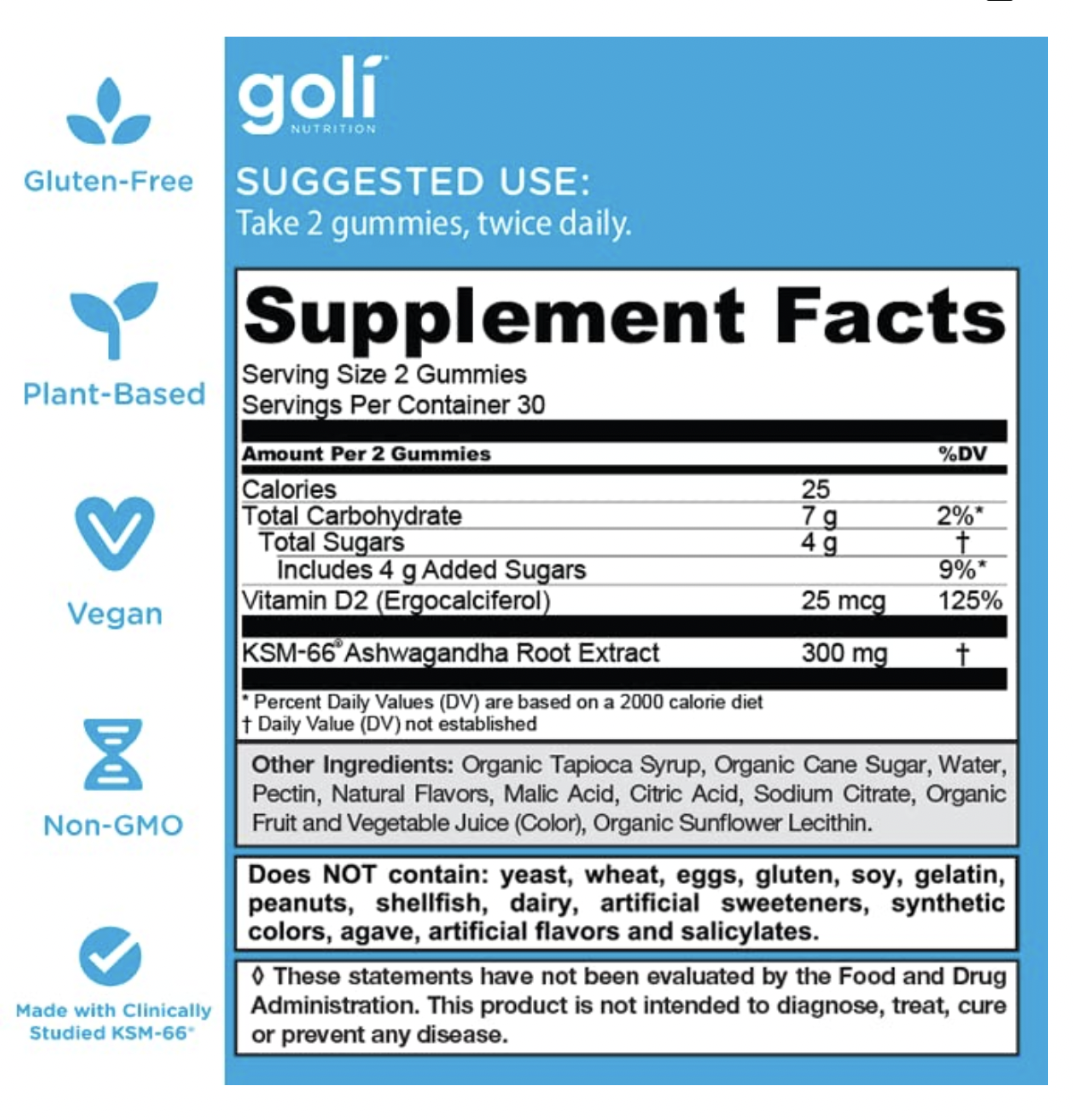 -Each bottle of Goli Ashwagandha contains 60 delicious vegan, non-gmo, gluten-free & gelatin free Ashwa gummies