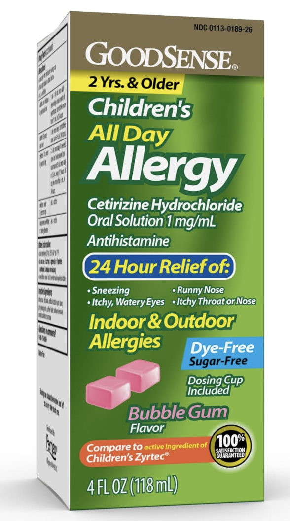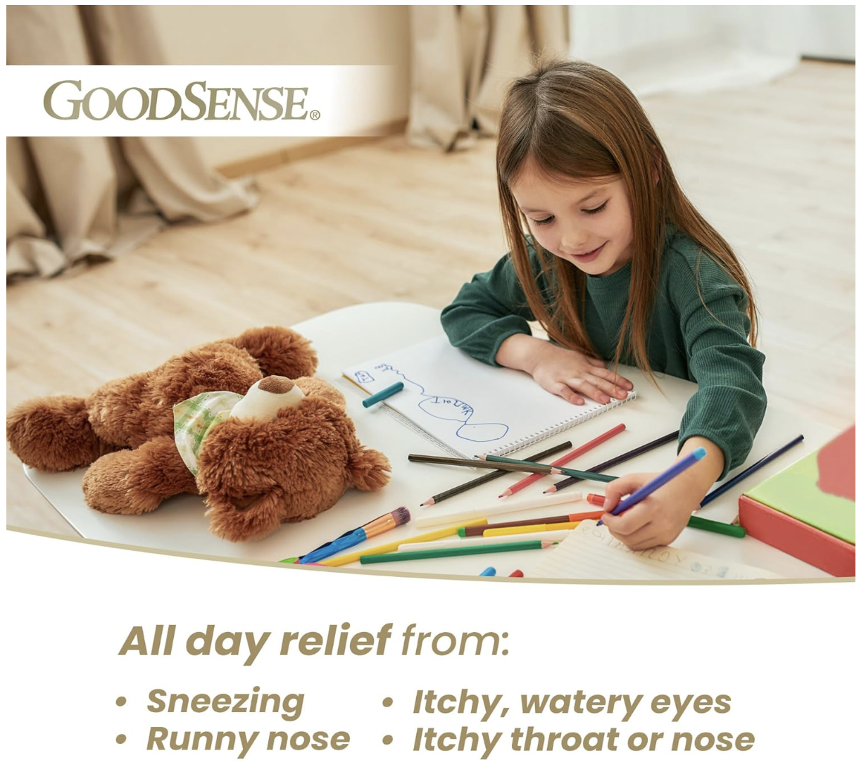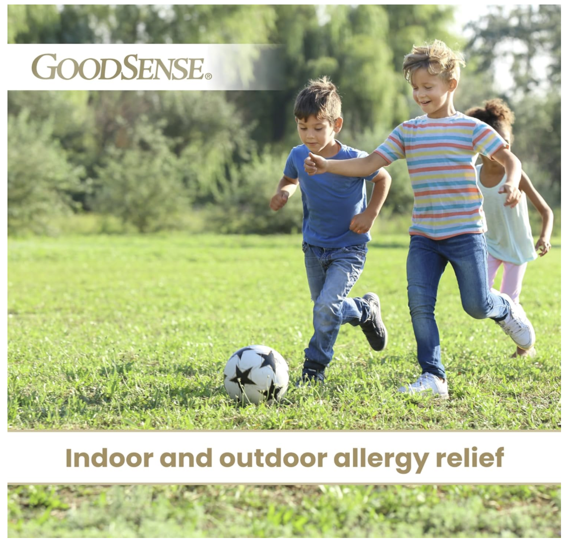 - GoodSense Children’s All Day Allergy Relief treats both indoor and outdoor allergy symptoms such as sneezing, runny nose, itchy throat or nose and itchy, watery eyes.