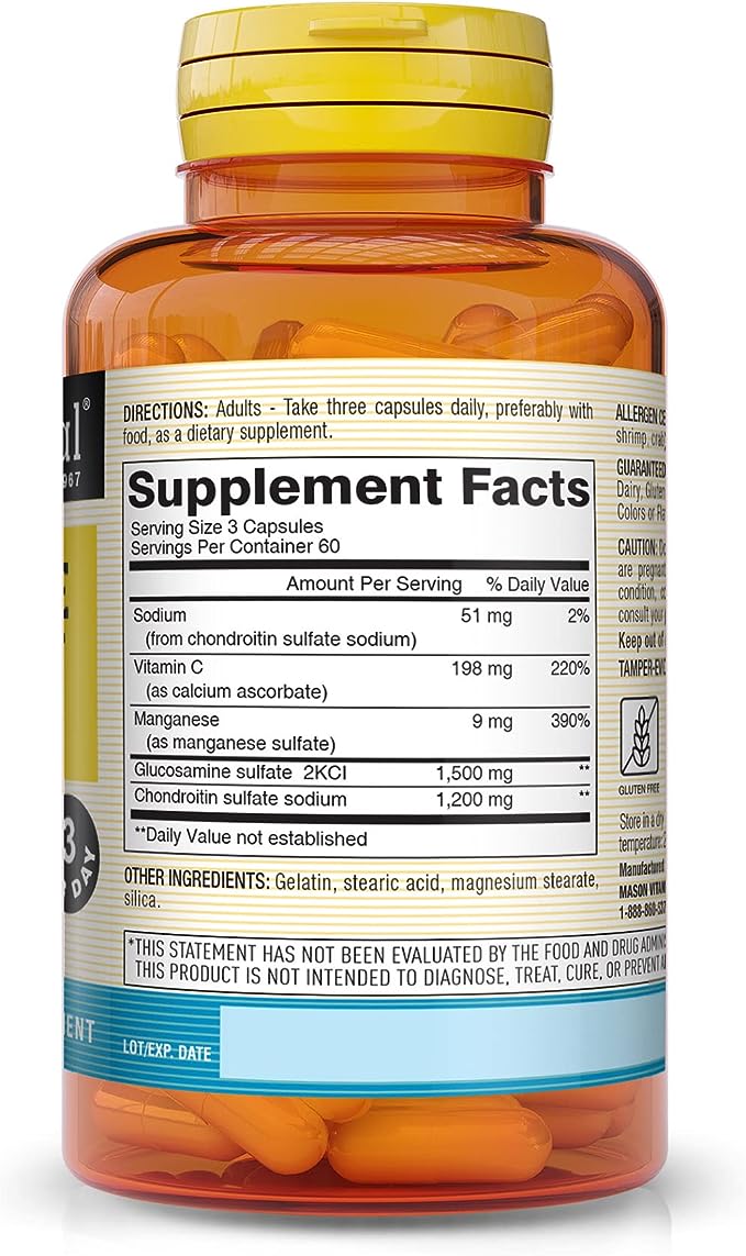 – Formula consists of 1500 mg glucosamine and 1200 mg of chondroitin, plus 198 mg of vitamin C, and 9 mg of the mineral manganese may support the normal, healthy structural integrity of joint cartilage.