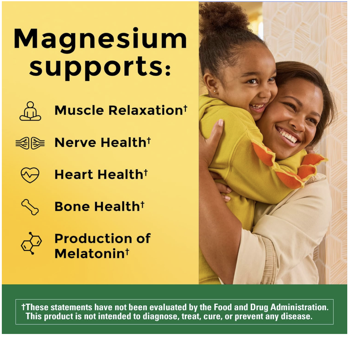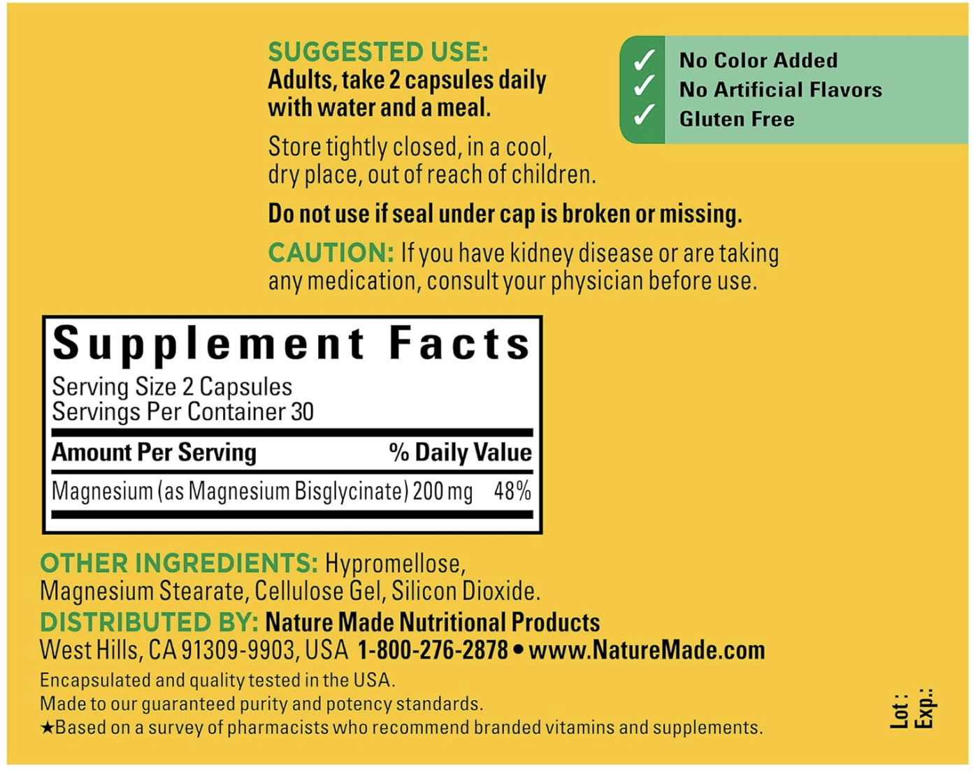 - Heart, nerve and bone support supplement: contains one 60 count bottle of Nature Made Magnesium Glycinate 200 mg per serving Capsules for a 30-day supply